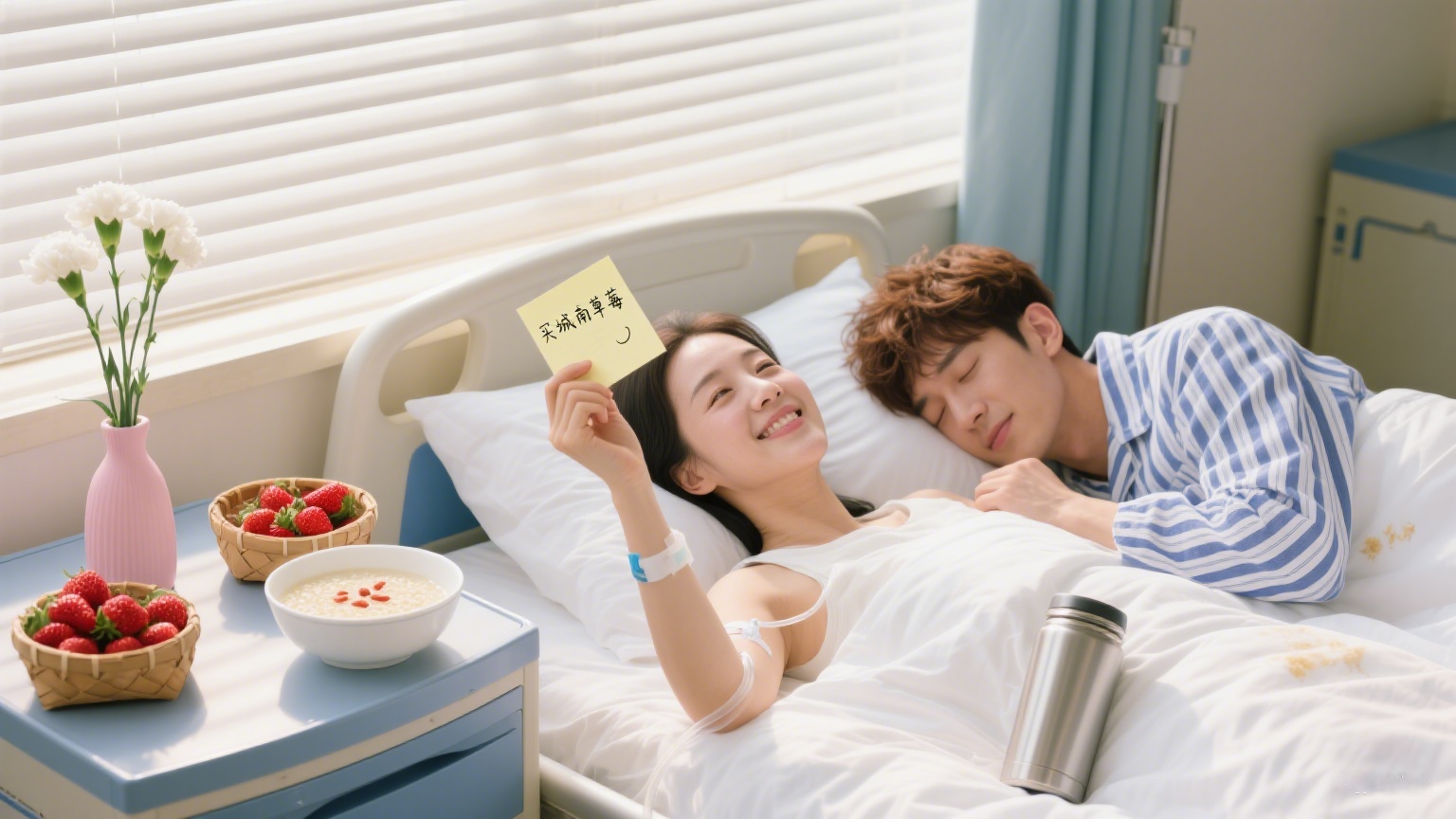 有一次,我醒來看見他趴在病床邊睡著了,手里還攥著一張寫滿字的紙。我輕輕拿過來看,上面記著 “早上 7 點(diǎn)喂藥,8 點(diǎn)喝粥,10 點(diǎn)幫她翻身”,還有一行小字:“她喜歡吃城南那家的草莓,明天記得去買。”